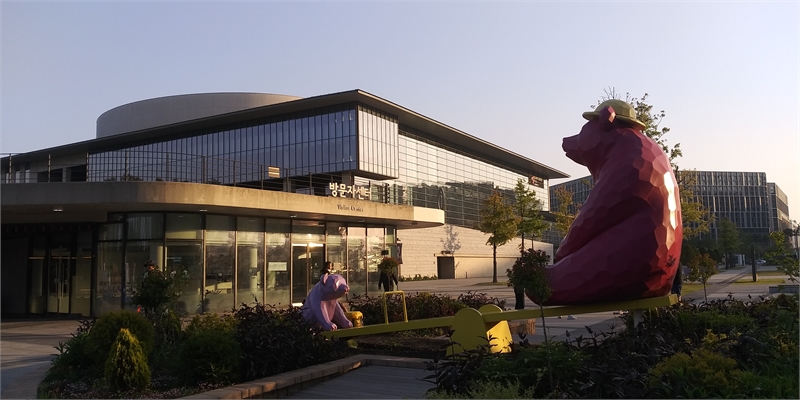 LG아트센터가 위치한 마곡나루역 서울식물원 쪽 광장에 커다란 어미곰과 아기곰이 시소(seesaw)를 타는 조형물이 설치돼 있다. 근처 건물은 서울식물원 방문자센터다.