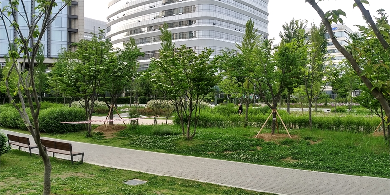 산딸나무가 하얗게 꽃을 피웠다. 뒤 건물이 오스틴임플란트 본사 건물이다. 왼쪽 건물은 호텔이다.