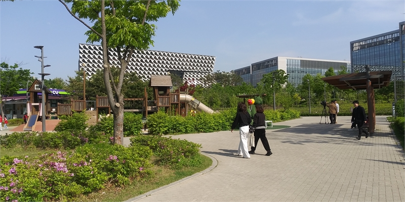 '숲문화학교' 앞 놀이터와 곰가족 조형물. 한 방송국에서 최근 며칠 새 곰가족 조형물이 논란이 되자 취재를 하고 있다.
