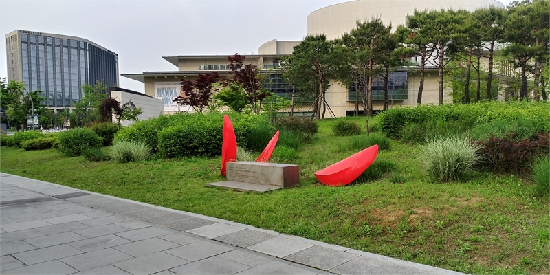 서울식물원 마곡나루역 입구 근처에 있는 빨간 잎을 형상화 한 조각 작품. 바로 뒷건물이 LG아트센터다.