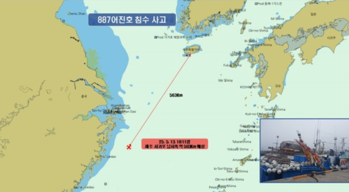 근해연승 어선 A호(모슬포 선적 29t)가 침몰한 서귀포시 남서쪽 563㎞ 해상 지점. 제주해양경찰청