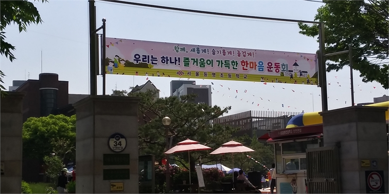 봄 운동회를 알리는 학교 정문 앞 현수막. 이날 행사 이름은 '한마음 운동회'다.
