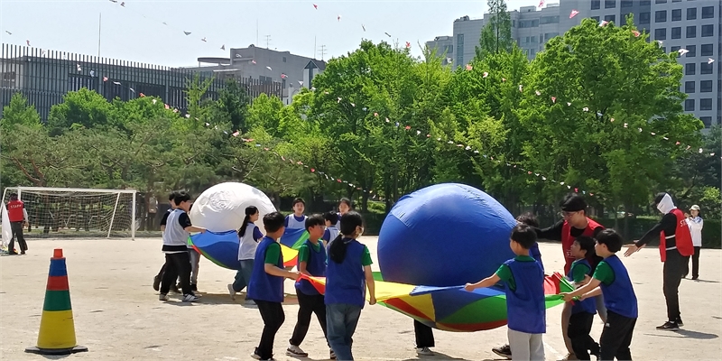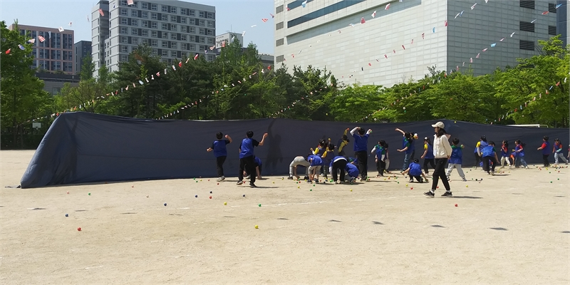 옛 운동회의 청백전을 연상하듯 청색과 백색의 큰 공을 다른 천으로 옮기는 게임으로 보였다.