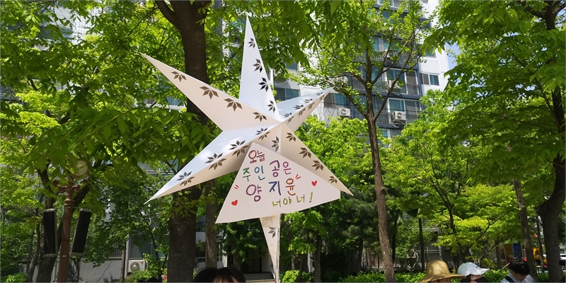 별 모양의 응원 도구엔 '오늘 주인공은 양지윤 너야 너!' 문구가 쓰여 있다.