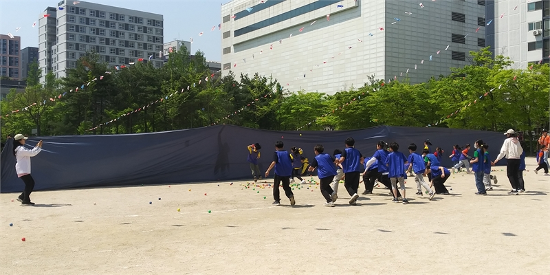 커다란 검은색 천을 운동장 가운데 쳐놓고 청팀과 백팀 학생들이 콩주머니를 상대 진영으로 던지고 있다.