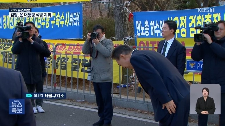 법원의 석방 결정으로 윤석열 전 대통령이 지난 3월 8일 경기 의왕시 서울구치소를 나오면서 정문 앞에서 지지자들에게 인사하고 있다. KBS 중계 캡처
