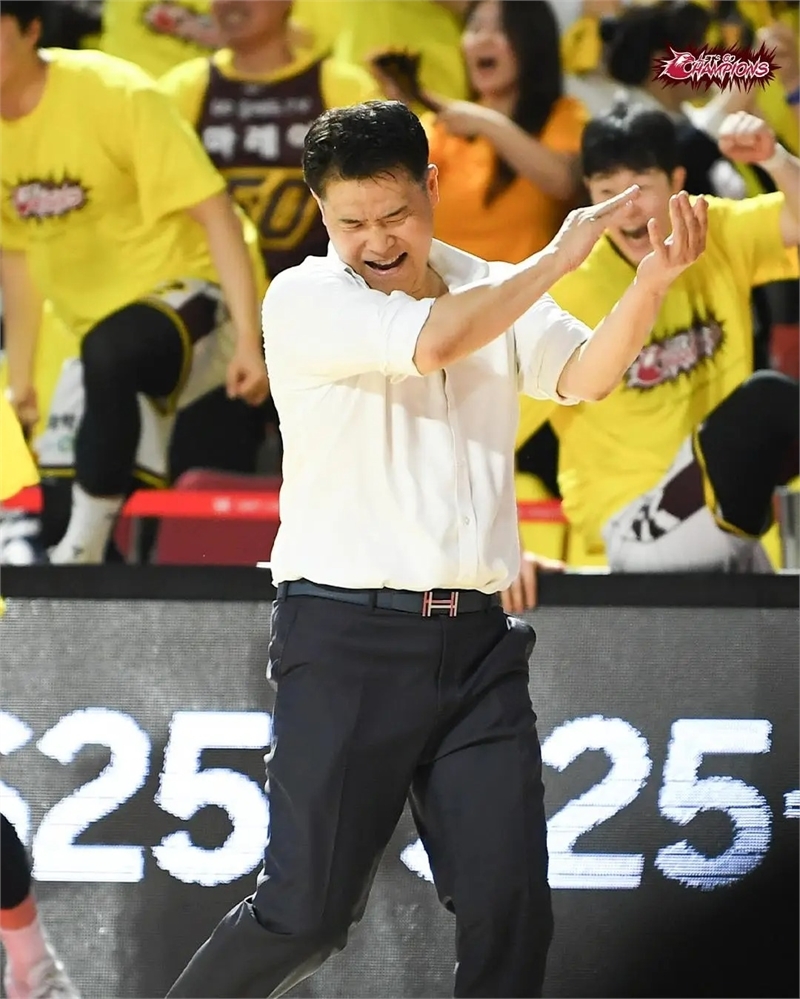 조상현 창원 LG 세이커스 감독이 17일 우승을 확정 짓자 손벽을 치며 기뻐하고 있다. KBL