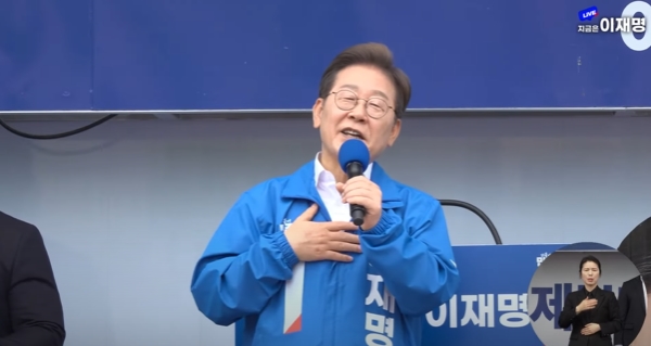 이재명 민주당 대선 후보가 16일 전북 군산시 옛 시청광장에서 열린 유세에서 연설하고 있다. 델리민주