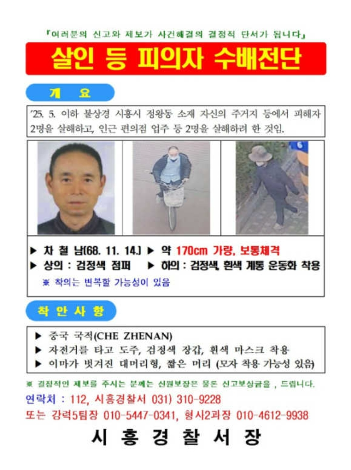 경찰이 19일 경기 시흥시 흉기 난동 사건의 용의자인 50대 중국동포 차철남을 공개수배 했다.