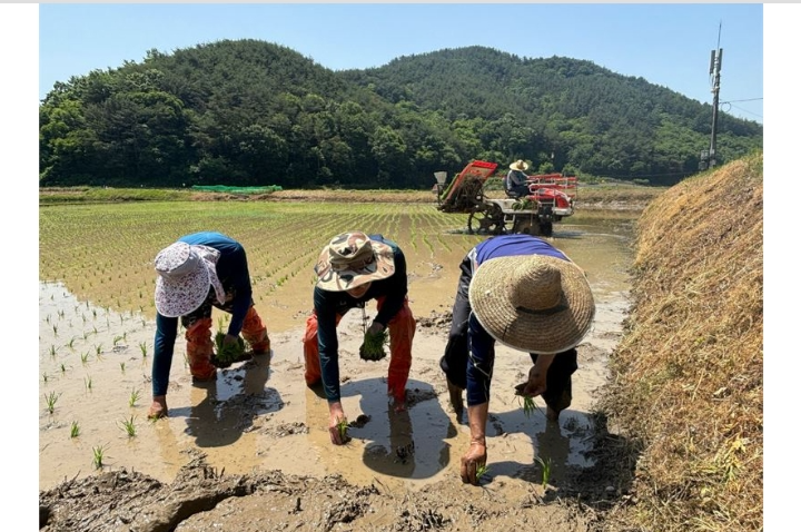 경남 진주시 명석면농민회 회원들이 이앙기가 심지 못한 논 귀퉁이에 손모를 내고 있다. 뒤엔 이앙기가 모를 심고 있다. 진주시