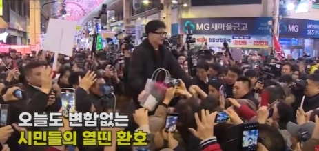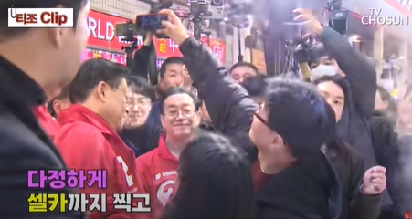 한동훈 전 국민의힘 대표가 22일 충북 청주시 육거리시장에서 김문수 후보 지원 유세 도중 한 젊은이의 요청에 셀카를 찍고 있다. TV조선