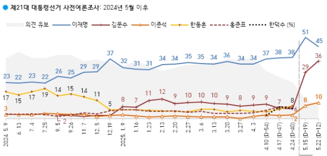 한국갤럽이 지난 20∼22일 만 18세 이상 유권자 1002명을 대상으로 조사(95% 신뢰수준에 표본오차 ±3.1%포인트)해 23일 발표한 결과, 김문수 국민의힘 후보의 지지율은 직전 조사(5월 3주)와 비교해 7%포인트 상승한 36%를 기록했다. 반면 이재명 더불어민주당 대선 후보는 직전 조사 대비 6%p 하락한 45%였다.