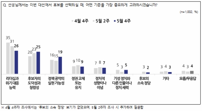 대선 핵심 과제로는 ‘민생 경제 회복’이 49%로 가장 많았다. 이어 ‘정치제도 개혁’, ‘사회갈등 해소’, ‘일자리와 고용 확대’였다.