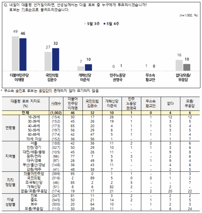 한국갤럽이 지난 20∼22일 만 18세 이상 1002명을 대상으로 조사해 공개한 여론조사에 따르면, 이 후보의 지지율은 전주보다 6%p 하락한 45%로 집계됐다. 반면 김 후보는 36%로 전주보다 7%p 상승했다. 대선 국면에서 처음으로 두 후보의 지지율 격차가 한 자릿수로 좁혀졌다.