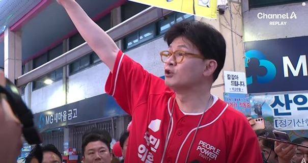 한동훈 국민의힘 전 대표가 22일 충북 청주 육거리시장에서 김문수 대선 후보 지원 유세를 하고 있다. 채널A