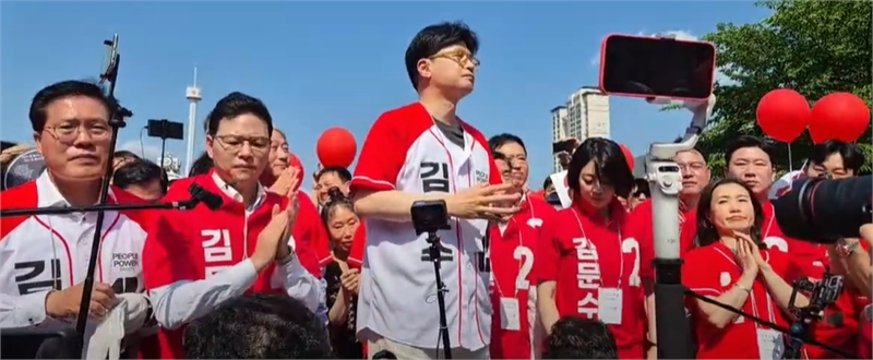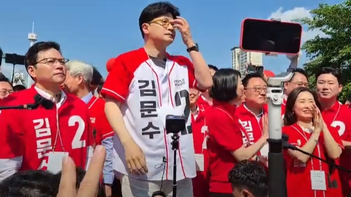 한동훈 전 국민의힘 대표가 25일 ‘김문수’ 이름이 적힌 국민의힘 선거 운동복을 입고 서울 유세에 나섰다. 한 전 대표가 김문수 국민의힘 대선 후보의 이름이 적힌 옷을 입은 것은 지난 20일 부산에서 첫 현장 유세를 한 지 4번째 만이다.