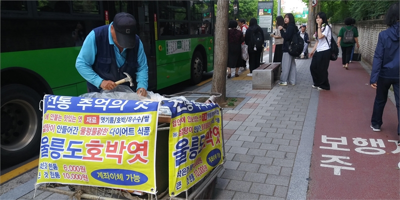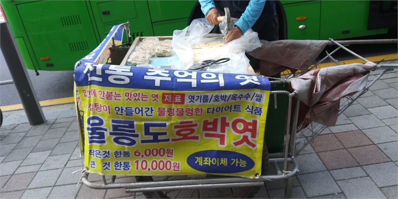 엿장수 어르신이 망치로 날렵한 정을 비껴치며 자칭 '울릉도 호박엿'을 자르고 있다. 엿판 위에 커다란 엿가위가 있다. 계좌이체도 가능하는 문구도 이채롭게 다가선다.
