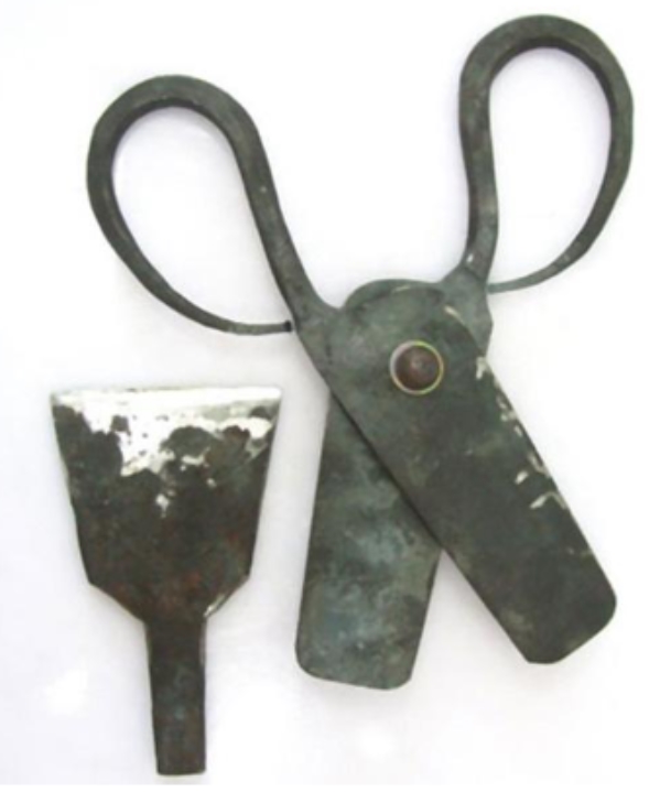 행인을 불러모으는 엿가위와 엿을 자르는 납작한 정. 요즘은 민속품으로 인터넷에서 중고품으로 판다. 이 엿기구는 5만 6천 원에 나와 있다. 11번가