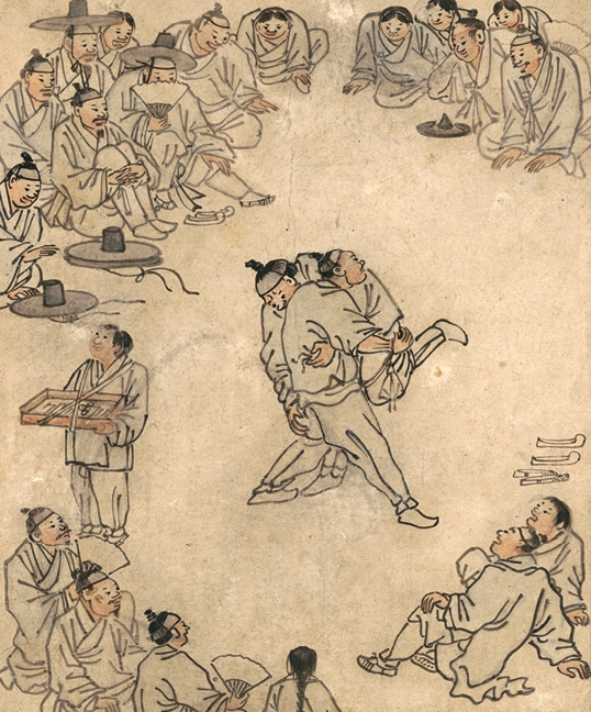조선 후기 풍속화가 김홍도의 '씨름'. 왼쪽 아동이 엿판을 목에 걸고 있다.