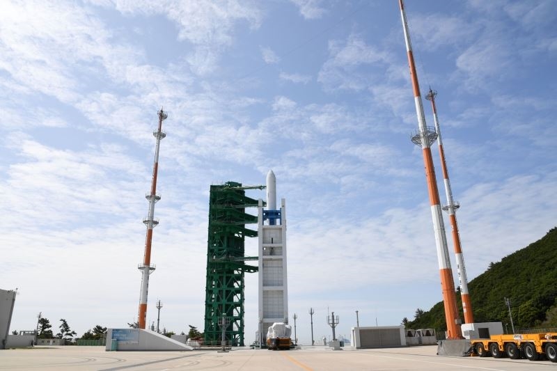 기립된 누리호가 지난 2023년 5월 25일 전남 고흥군 나로우주센터 발사대에 고정돼 있다. 이날 발사 성공으로 우리나라는 세계 7번째로 독자 위성을 쏘아올린 국가가 됐다. 한국항공우주연구원 제공