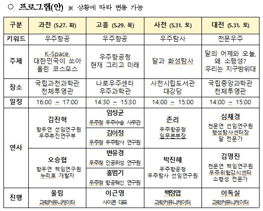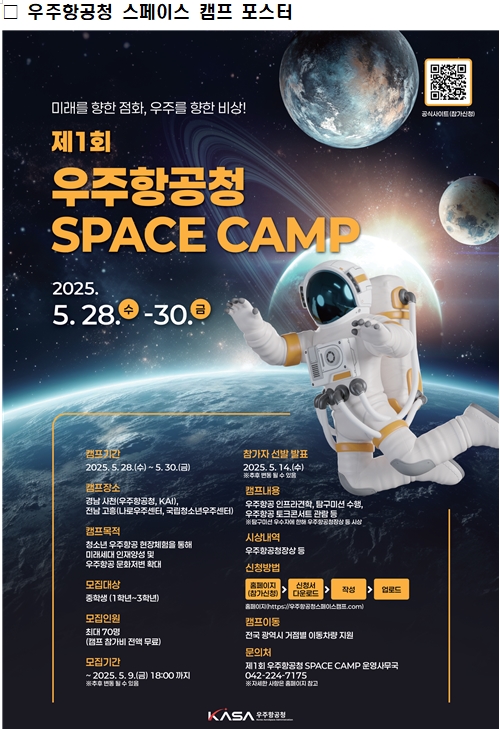 이 기간에 우주항공청은 ▲사천·고흥·대전·과천에서 우주항공 전문가와 과학 커뮤니케이터가 진행하는 ‘우주항공 토크 콘서트’ ▲중학생 70명이 28~30일 사천·고흥 일대를 돌아보며 우주항공청, KAI, 나로우주센터를 체험하며 팀별 우주 미션 수행을 경험하는 ‘제1회 스페이스 캠프’를 주관한다.
