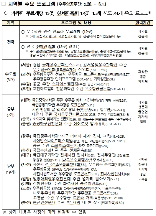 전국의 12곳 과학관 무료 개방, 13곳 시민천문대의 천체관측회를 비롯해 전국 15개 시도 34개 주요 프로그램들이 운영될 예정이다.
