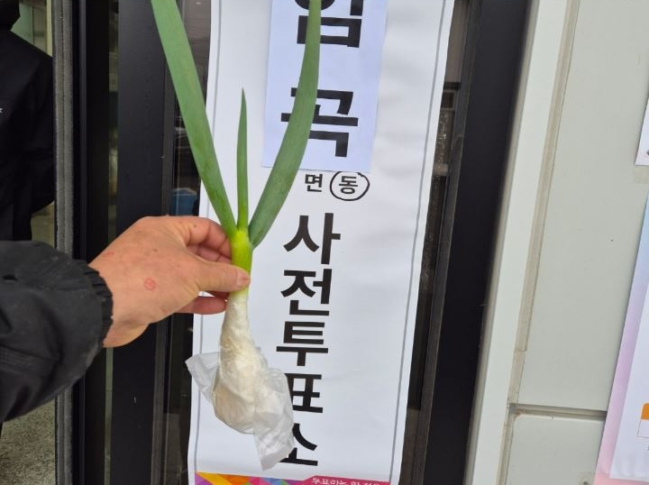 제22대 총선 사전선거 첫날인 4월 5일 오전 광주 광산구 임곡동 사전투표소에서 한 유권자가 대파 인증을 하고 있다. SNS