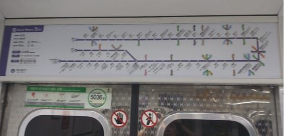 지하철 5호선 객차 안과 노선도. 정기홍 기자