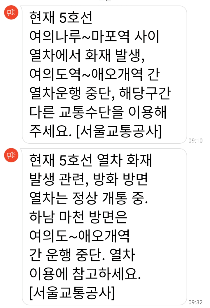 이 화재로 여의도역(방화역 쪽 여의나루역 앞 역)~애오개역(마포역 뒷 역) 간 열차 운행이 중단됐다가 개통됐다.