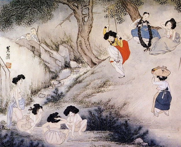 조선 중기 풍속 화가 신윤복의 '단오도'. 그네를 뛰고 있는 가운데, 웃옷을 벗고 머리를 감는 여인들의 모습을 동네 사내들이 숨어서 지켜보고 있다.