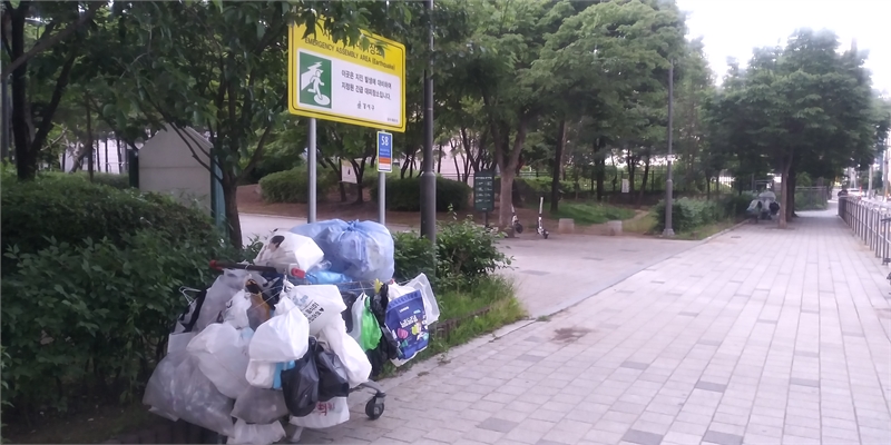 서낭당공원 인도변에 크고 작은 쓰레기 비닐봉투를 가득 담고 매단 카트 모습. 저 멀리 또 다른 비슷한 모습의 카트가 보인다. 처음엔 조금씩 담겼다가 가득해지는데, 사진은 가득해진 모습이다. 저 멀리 카트쪽으로 조금 더 가면 강서구청사거리~가양대교 간 대로변이다.