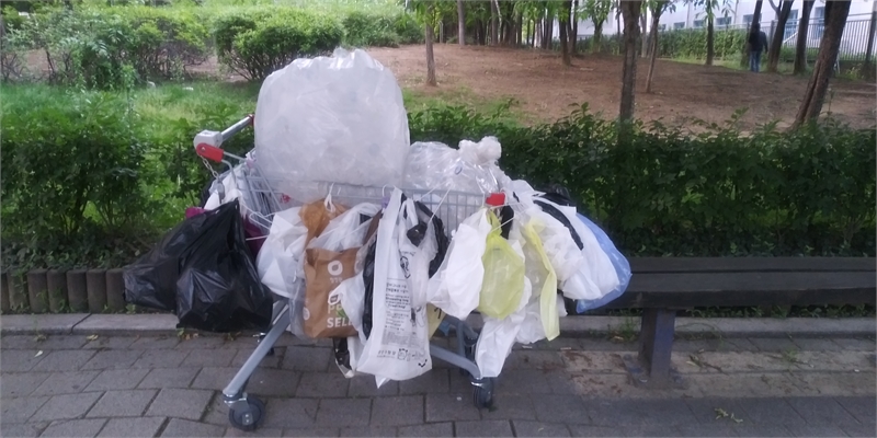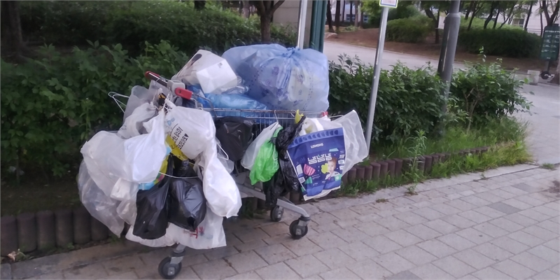 근린공원 인도변의, 쓰레기 비닐봉투를 가득 실은 카트(작은 손수레) 모습입니다. 지난 5월 24일 서울 강서구청사거리 공항대로 한강쪽 뒷길 인도에서 목격했습니다. 누가 왜 저런 행동을 할까, 고개가 갸웃뚱해지는 광경입니다.