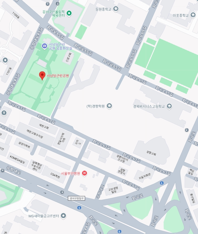 서울 강서구 서낭당근린공원 위치도. 오른쪽 아래는 강서구청사거리이고, 공항대로 왼쪽으로 가면 서울식물원이 있는 마곡과 김포공항이 나온다. 구글 맵