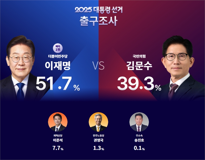 KBS, MBC, SBS 등 지상파 방송 3사는 3일 오후 8시 출구조사에서 이재명 후보가 51.7%, 김문수 후보가 39.3%를 기록했다고 보도했다. 개혁신당 이준석 후보는 7.7%로 조사됐다.