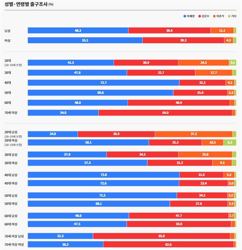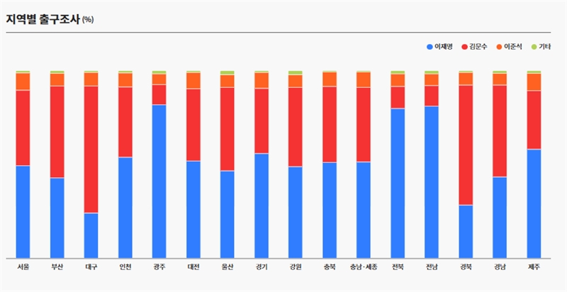 6·3 조기대선 지상파 3사의 출구 조사에서 더불어민주당 이재명 대선 후보가 국민의힘 김문수 후보를 오차범위 밖에서 앞서며 1위를 기록한 것으로 나왔다.