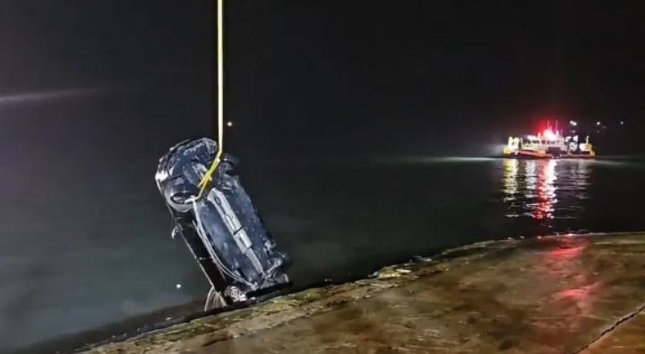 2일 밤 전남 진도군 진도항 인근 바다 밑에서 일가족이 탄 차량을 해경이 인양하고 있다. 목포해경