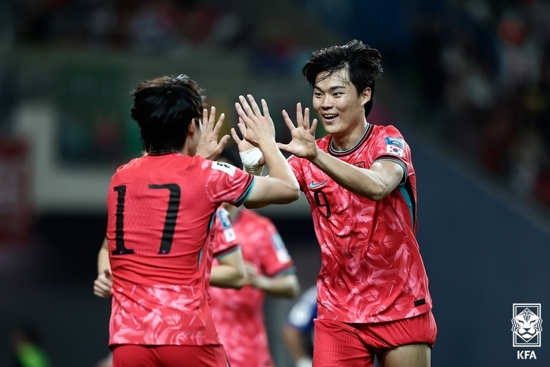 한국의 세 번째 골을 터뜨린 오현규(등번호 9)가 세리머니를 펼치고 있다. 이상 대한축구협회