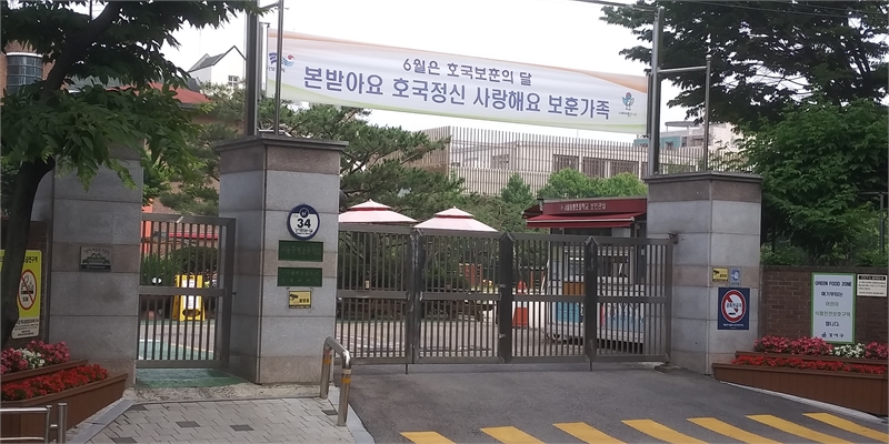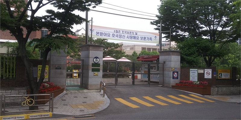 15일 서울 강서구 등촌동의 한 초등학교 정문에 걸어놓은 '호국보훈의 달' 현수막입니다. '본받아요 호국정신, 사랑해요 보훈가족'이란 문구를 새겼네요.