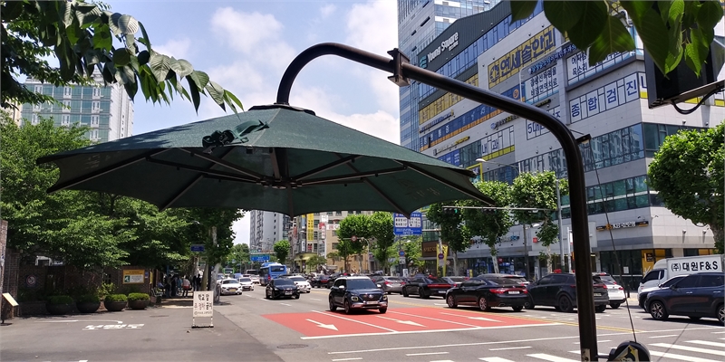 서울 강서구 가양동 한 도로에 설치된 횡단보도그늘막. 낮최고기온이 30도를 오르내려 그늘이 유독 눈에 들어온다.