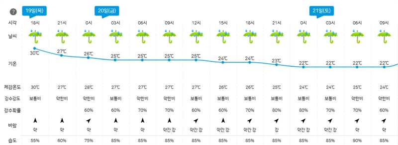 19일 밤부터 중부 지방에 장맛비가 쏟아져 사전 준비를 철저히 해야 한다. 반면 이날 낮 최고기온은 30도 안팎으로, 34도까지 예보된 지역도 있다.