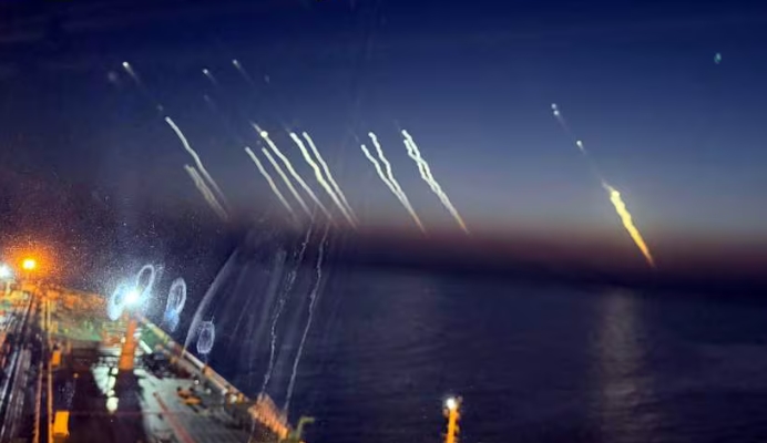 호르무즈 해협을 항해 중인 한국 선박에서 18일 촬영한 이란의 미사일 발사 모습. 전국해상선원노동조합 제공
