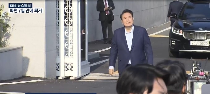 윤석열 전 대통령이 서울 용산구 대통령 관저 정문에서 차에서 내려 걸어나오고 있다. KBS 뉴스 특보