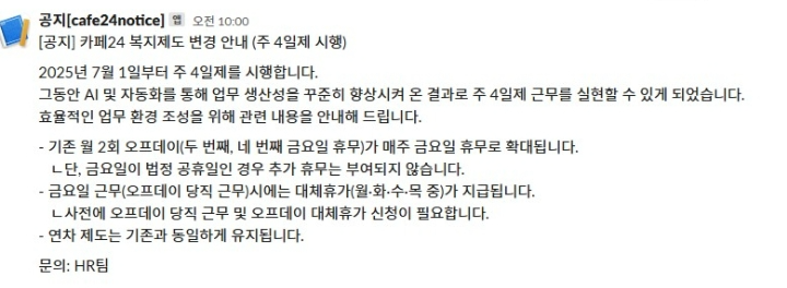 카페24는 26일 임직원들에게 "기존 월 2회 오프데이(휴무)가 매주 금요일 휴무로 확대된다"며 7월 1일부터 주 4일제 시행을 고지했다.