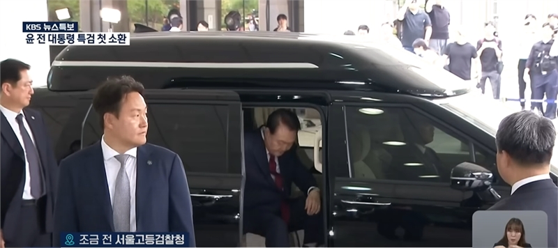 윤석열 전 대통령이 28일 서울 서초구 서울고검 청사에서 진행될 내란 특검 대면조사를 받기 위해 차량에서 내리고 있다. 경호처 직원들이 경호를 하고 있다. KBS 특보 캡처