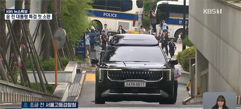윤석열 전 대통령이 탄 경호 차량이 내란 특검 대면조사를 받기 위해 지난 6월 28일 서울 서초구 서울고검 청사로 들어서고 있다. KBS 특보 캡처