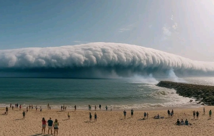 이 영상엔 거대한 구름 덩어리가 바다에서 해변 쪽으로 밀려오자 해수욕객들이 쓰나미로 착각해 당황하는 모습이 담겼다.
