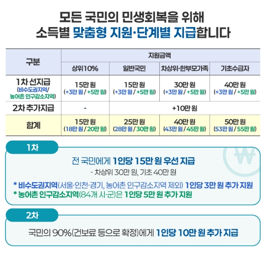 2차 지급은 건강보험료를 기준으로 한 소득 선별 과정을 거쳐 국민의 90%에게 1인당 10만 원을 추가 지급한다.