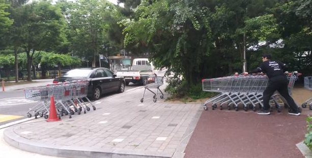 백화점 아르바이트생이 서울의 한 아파트 단지에 있는 카트를 다시 매장으로 가져가기 위해 이동시키고 있다. 정기홍 기자