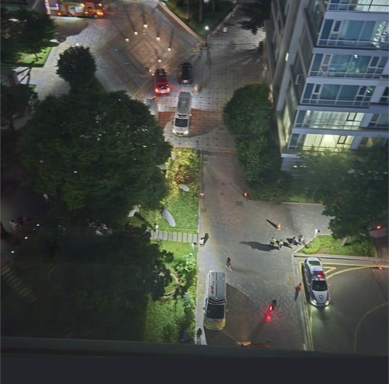 20일 인천 송도국제신도시 한 아파트 단지에 구급차와 경찰차가 출동해 있다. 이 아파트에서는 총기 발사 사고가 났다. 에펨코리아