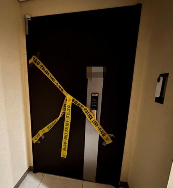 20일 사제 총기로 아들을 살해한 사건이 난 인천 연수구 송도동의 한 아파트 현관 앞에 폴리스라인이 쳐져 있다. 독자 제공